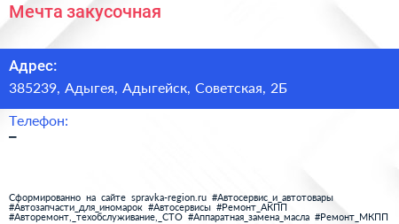 Мечта, закусочная по адресу 385239, Адыгея, Адыгейск, Советская, 2Б в дальнейшем Организация, размещена в следующих категориях: