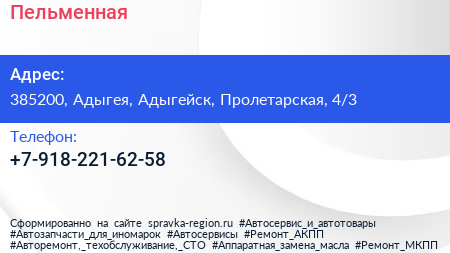 Пельменная по адресу 385200, Адыгея, Адыгейск, Пролетарская, 4/3 в дальнейшем Организация, размещена в следующих категориях: