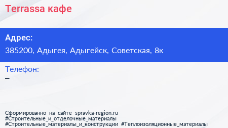 Terrassa, кафе по адресу 385200, Адыгея, Адыгейск, Советская, 8к в дальнейшем Организация, размещена в следующих категориях: