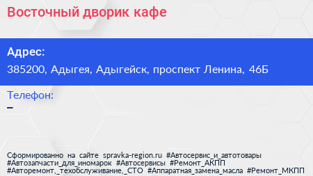 Восточный дворик, кафе по адресу 385200, Адыгея, Адыгейск, проспект Ленина, 46Б в дальнейшем Организация, размещена в следующих категориях:
