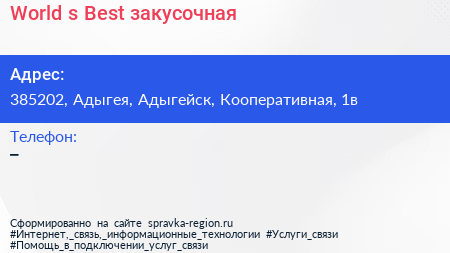 World`s Best, закусочная по адресу 385202, Адыгея, Адыгейск, Кооперативная, 1в в дальнейшем Организация, размещена в следующих категориях:
