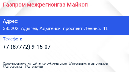 Газпром межрегионгаз Майкоп по адресу 385202, Адыгея, Адыгейск, проспект Ленина, 41 в дальнейшем Организация, размещена в следующих категориях:
