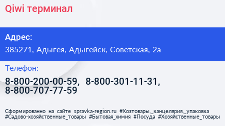 Qiwi, терминал по адресу 385271, Адыгея, Адыгейск, Советская, 2а в дальнейшем Организация, размещена в следующих категориях: