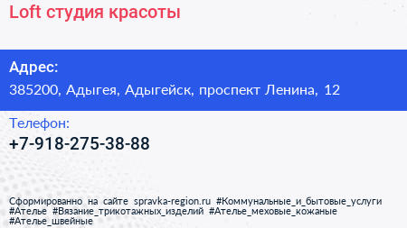 Loft, студия красоты по адресу 385200, Адыгея, Адыгейск, проспект Ленина, 12 в дальнейшем Организация, размещена в следующих категориях: