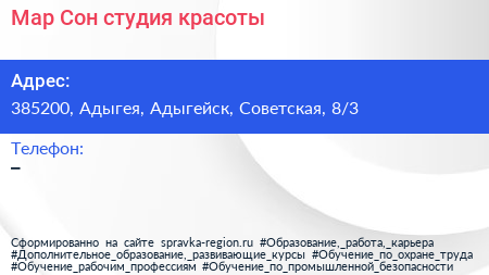 Мар Сон, студия красоты по адресу 385200, Адыгея, Адыгейск, Советская, 8/3 в дальнейшем Организация, размещена в следующих категориях: