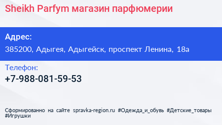 Sheikh Parfym, магазин парфюмерии по адресу 385200, Адыгея, Адыгейск, проспект Ленина, 18а в дальнейшем Организация, размещена в следующих категориях: