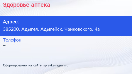 Здоровье, аптека по адресу 385200, Адыгея, Адыгейск, Чайковского, 4а в дальнейшем Организация, размещена в следующих категориях: