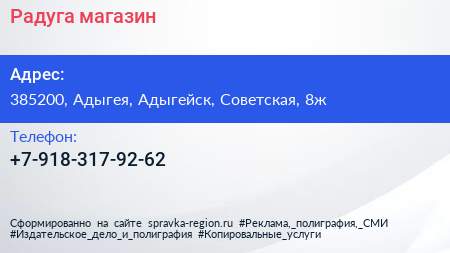 Радуга, магазин по адресу 385200, Адыгея, Адыгейск, Советская, 8ж в дальнейшем Организация, размещена в следующих категориях: