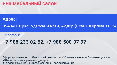 Яна, мебельный салон по адресу 354340, Краснодарский край, Адлер (Сочи), Кирпичная, 24 в дальнейшем Организация, размещена в следующих категориях:
