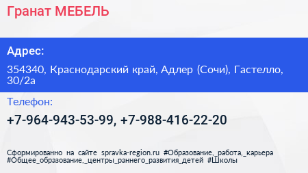 Гранат МЕБЕЛЬ по адресу 354340, Краснодарский край, Адлер (Сочи), Гастелло, 30/2а в дальнейшем Организация, размещена в следующих категориях: