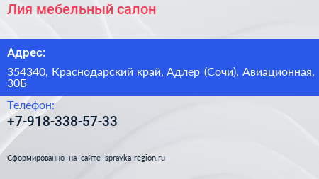 Лия, мебельный салон по адресу 354340, Краснодарский край, Адлер (Сочи), Авиационная, 30Б в дальнейшем Организация, размещена в следующих категориях: