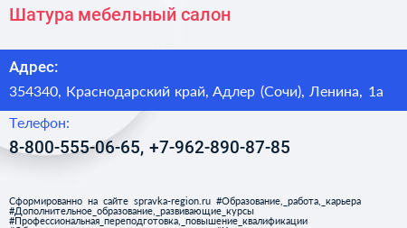 Шатура, мебельный салон по адресу 354340, Краснодарский край, Адлер (Сочи), Ленина, 1а в дальнейшем Организация, размещена в следующих категориях: