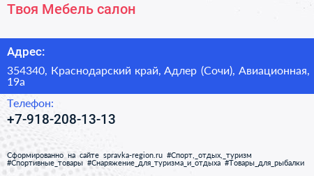 Твоя Мебель, салон по адресу 354340, Краснодарский край, Адлер (Сочи), Авиационная, 19а в дальнейшем Организация, размещена в следующих категориях: