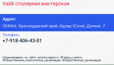 Valdi, столярная мастерская по адресу 354066, Краснодарский край, Адлер (Сочи), Дачная, 7 в дальнейшем Организация, размещена в следующих категориях: