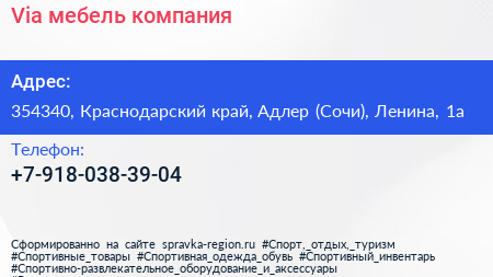 Via мебель, компания по адресу 354340, Краснодарский край, Адлер (Сочи), Ленина, 1а в дальнейшем Организация, размещена в следующих категориях:
