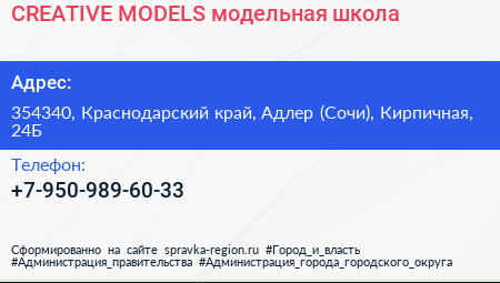 CREATIVE MODELS, модельная школа по адресу 354340, Краснодарский край, Адлер (Сочи), Кирпичная, 24Б в дальнейшем Организация, размещена в следующих категориях:
