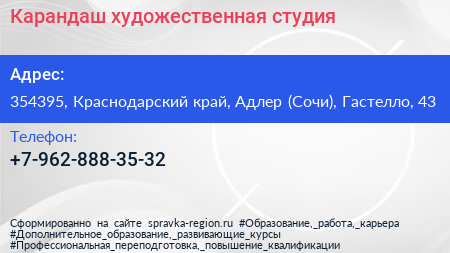 Карандаш, художественная студия по адресу 354395, Краснодарский край, Адлер (Сочи), Гастелло, 43 в дальнейшем Организация, размещена в следующих категориях: