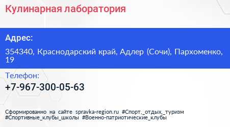 Кулинарная лаборатория по адресу 354340, Краснодарский край, Адлер (Сочи), Пархоменко, 19 в дальнейшем Организация, размещена в следующих категориях: