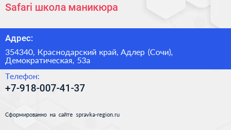 Safari, школа маникюра по адресу 354340, Краснодарский край, Адлер (Сочи), Демократическая, 53а в дальнейшем Организация, размещена в следующих категориях: