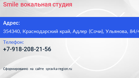 Smile, вокальная студия по адресу 354340, Краснодарский край, Адлер (Сочи), Ульянова, 84/4 в дальнейшем Организация, размещена в следующих категориях: