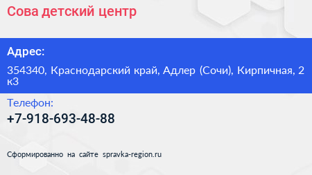 Сова, детский центр по адресу 354340, Краснодарский край, Адлер (Сочи), Кирпичная, 2 к3 в дальнейшем Организация, размещена в следующих категориях: