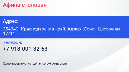 Афина, столовая по адресу 354340, Краснодарский край, Адлер (Сочи), Цветочная, 17/11 в дальнейшем Организация, размещена в следующих категориях: