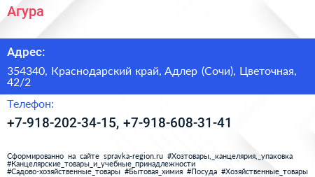 Агура по адресу 354340, Краснодарский край, Адлер (Сочи), Цветочная, 42/2 в дальнейшем Организация, размещена в следующих категориях: