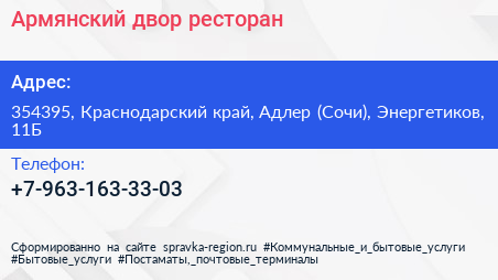 Армянский двор, ресторан по адресу 354395, Краснодарский край, Адлер (Сочи), Энергетиков, 11Б в дальнейшем Организация, размещена в следующих категориях: