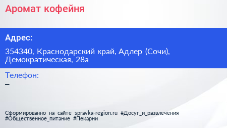 Аромат, кофейня по адресу 354340, Краснодарский край, Адлер (Сочи), Демократическая, 28а в дальнейшем Организация, размещена в следующих категориях: