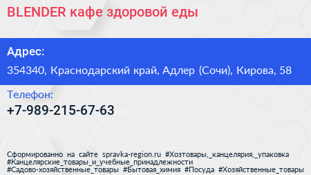 BLENDER, кафе здоровой еды по адресу 354340, Краснодарский край, Адлер (Сочи), Кирова, 58 в дальнейшем Организация, размещена в следующих категориях: