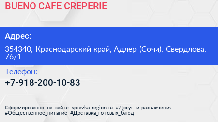 BUENO CAFE CREPERIE по адресу 354340, Краснодарский край, Адлер (Сочи), Свердлова, 76/1 в дальнейшем Организация, размещена в следующих категориях: