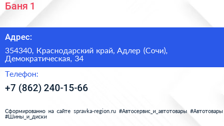 Баня №1 по адресу 354340, Краснодарский край, Адлер (Сочи), Демократическая, 34 в дальнейшем Организация, размещена в следующих категориях:
