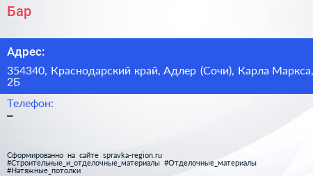 Бар по адресу 354340, Краснодарский край, Адлер (Сочи), Карла Маркса, 2Б в дальнейшем Организация, размещена в следующих категориях:
