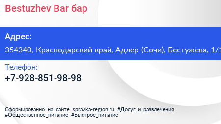 Bestuzhev Bar, бар по адресу 354340, Краснодарский край, Адлер (Сочи), Бестужева, 1/1 в дальнейшем Организация, размещена в следующих категориях: