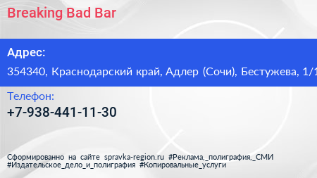 Breaking Bad Bar по адресу 354340, Краснодарский край, Адлер (Сочи), Бестужева, 1/1 в дальнейшем Организация, размещена в следующих категориях: