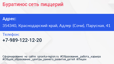 Буратинос, сеть пиццерий по адресу 354340, Краснодарский край, Адлер (Сочи), Парусная, 41 в дальнейшем Организация, размещена в следующих категориях: