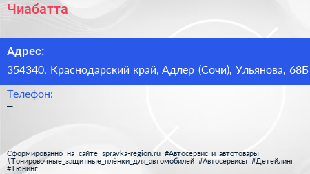 Чиабатта по адресу 354340, Краснодарский край, Адлер (Сочи), Ульянова, 68Б в дальнейшем Организация, размещена в следующих категориях: