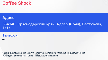 Coffee Shock по адресу 354340, Краснодарский край, Адлер (Сочи), Бестужева, 1/1з в дальнейшем Организация, размещена в следующих категориях:
