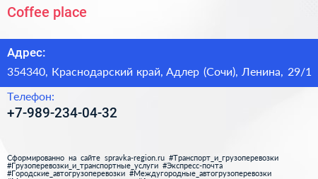 Coffee place по адресу 354340, Краснодарский край, Адлер (Сочи), Ленина, 29/1 в дальнейшем Организация, размещена в следующих категориях: