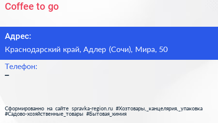 Coffee to go по адресу Краснодарский край, Адлер (Сочи), Мира, 50 в дальнейшем Организация, размещена в следующих категориях: