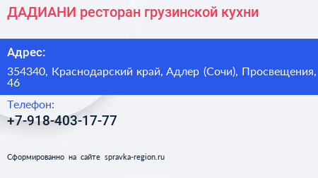 ДАДИАНИ, ресторан грузинской кухни по адресу 354340, Краснодарский край, Адлер (Сочи), Просвещения, 46 в дальнейшем Организация, размещена в следующих категориях: