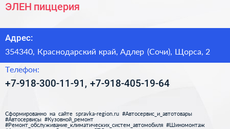 ЭЛЕН, пиццерия по адресу 354340, Краснодарский край, Адлер (Сочи), Щорса, 2 в дальнейшем Организация, размещена в следующих категориях: