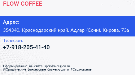 FLOW COFFEE по адресу 354340, Краснодарский край, Адлер (Сочи), Кирова, 73а в дальнейшем Организация, размещена в следующих категориях: