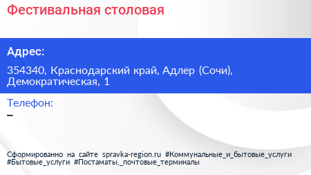 Фестивальная, столовая по адресу 354340, Краснодарский край, Адлер (Сочи), Демократическая, 1 в дальнейшем Организация, размещена в следующих категориях: