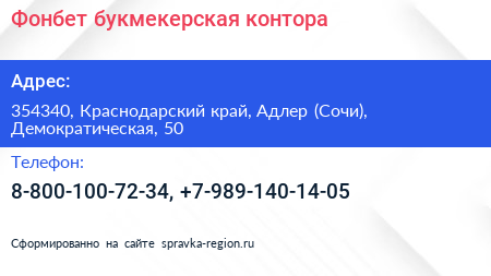 Фонбет, букмекерская контора по адресу 354340, Краснодарский край, Адлер (Сочи), Демократическая, 50 в дальнейшем Организация, размещена в следующих категориях: