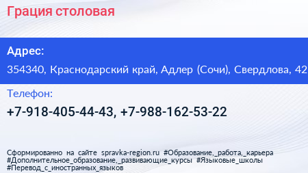 Грация, столовая по адресу 354340, Краснодарский край, Адлер (Сочи), Свердлова, 42 в дальнейшем Организация, размещена в следующих категориях: