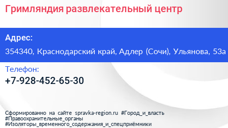 Гримляндия, развлекательный центр по адресу 354340, Краснодарский край, Адлер (Сочи), Ульянова, 53а в дальнейшем Организация, размещена в следующих категориях: