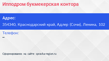 Ипподром, букмекерская контора по адресу 354340, Краснодарский край, Адлер (Сочи), Ленина, 102 в дальнейшем Организация, размещена в следующих категориях: