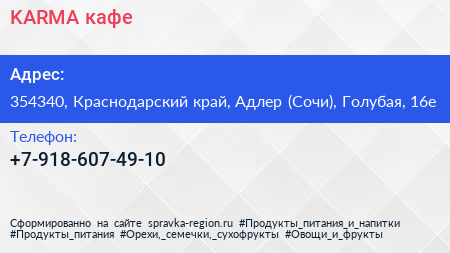KARMA, кафе по адресу 354340, Краснодарский край, Адлер (Сочи), Голубая, 16е в дальнейшем Организация, размещена в следующих категориях: