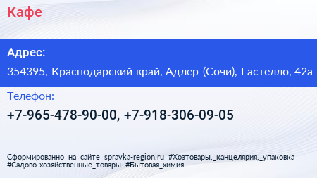 Кафе по адресу 354395, Краснодарский край, Адлер (Сочи), Гастелло, 42а в дальнейшем Организация, размещена в следующих категориях: